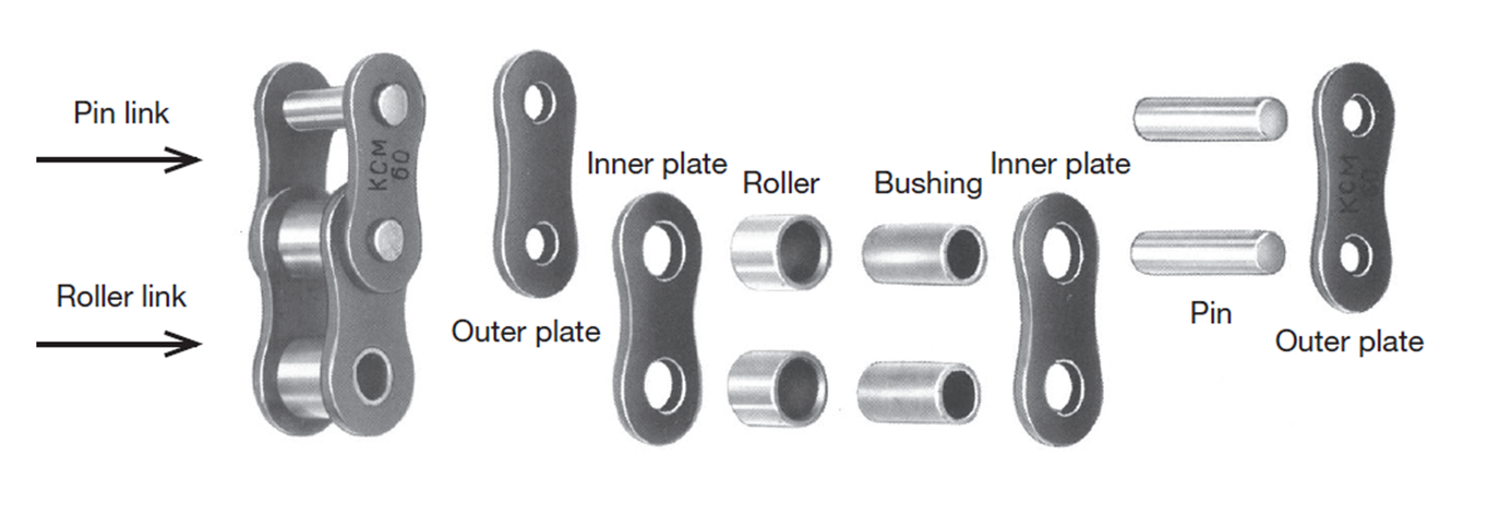 1.แผ่นเชื่อม (Link Plate) แบ่งเป็นแผ่นประกบด้านใน (Inner Plate) และแผ่นประกบด้านนอก (Outer Plate) เป็นชิ้นส่วนสำคัญที่รองรับดึง (Tensile Strength) ที่เกิดจากการหมุนของมอเตอร์ เป็นชิ้นส่วนที่มีความแข็งแรงเปรียบเสมือนกระดูกของมนุษย์ แผ่นเชื่อมด้านนอกมีหน้าที่อีกอย่างคือเป็นตัวเชื่อมระหว่างโซ่ในแต่ละข้อเข้าด้วยกัน