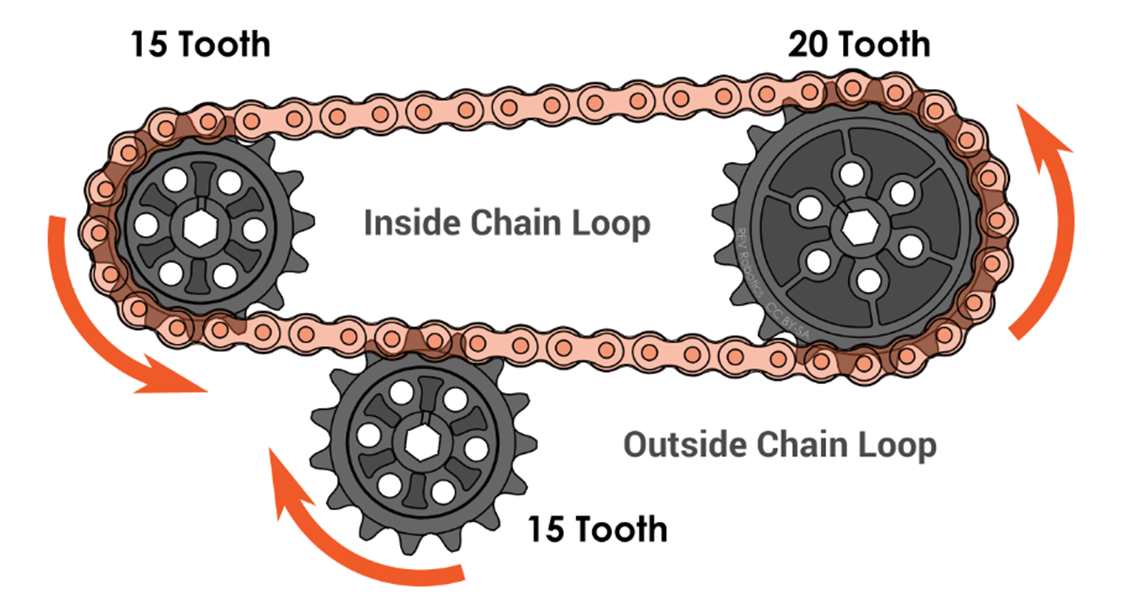 โซ่ (Roller Chain) จะถูกคล้องอยู่กับตัวเฟืองโซ่ (Sprocket) ที่ติดตั้งอยู่บนเพลาที่ขนาดกันของมอเตอร์ชุดขับและตัวตาม เฟืองโซ่จะถูกยึดให้แน่นด้วยและร่องลิ่ม (Keyway) และเกลียวที่ถูกต๊าปและขันจนแน่น เพื่อรองรับการบิดของมอเตอร์ที่หมุนอย่างต่อเนื่อง